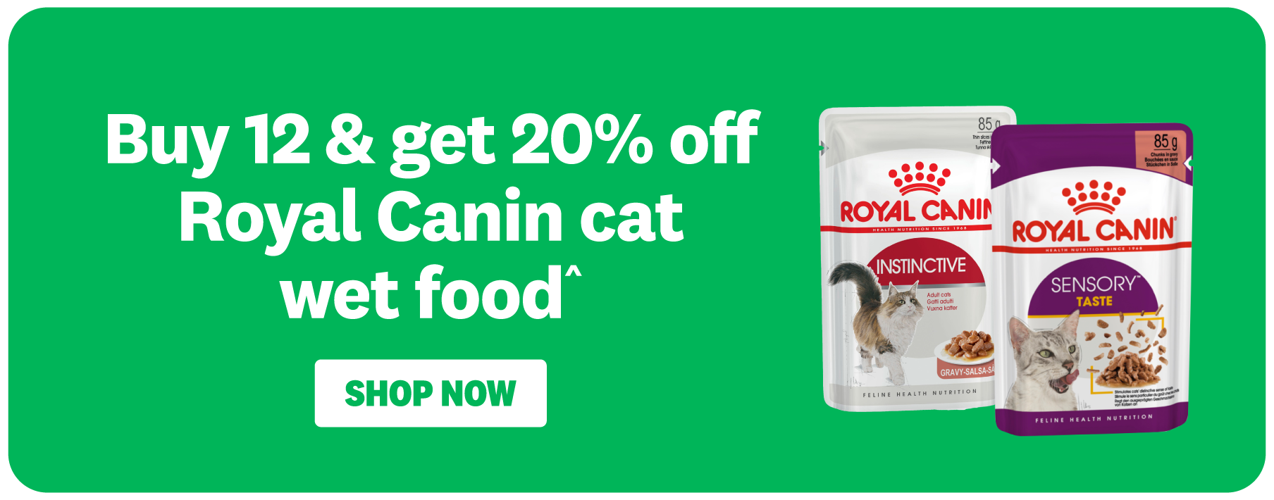 ^Buy 12 & get 20% off RRP on Royal Canin wet cat food only. Valid until 11:59pm, Monday 23 February 2026. Not valid in conjunction with any other offer. Excludes vet diets. We reserve the right to change or extend this offer at any time.